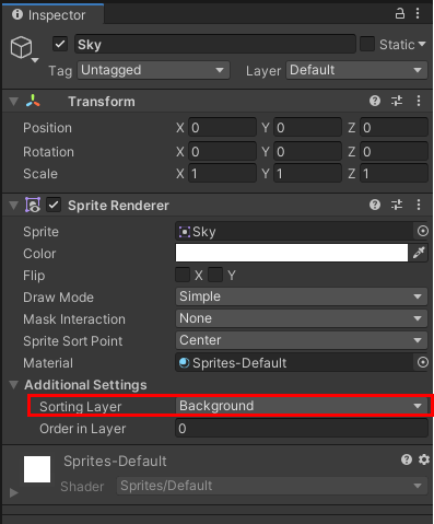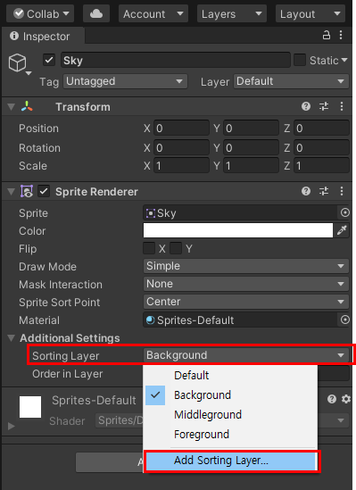Sprite Renderer -> Sorting Layer -> Add Sorting Layer 클릭