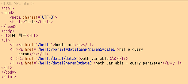 <li><a th:href="@{/hello/{param1}(param1=${param1}, param2=${param2})}">path variable + query parameter</a></li>