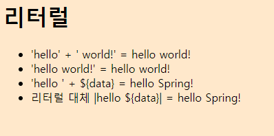 <li>리터럴 대체 |hello ${data}| = <span th:text="|hello ${data}|"></span></li>
