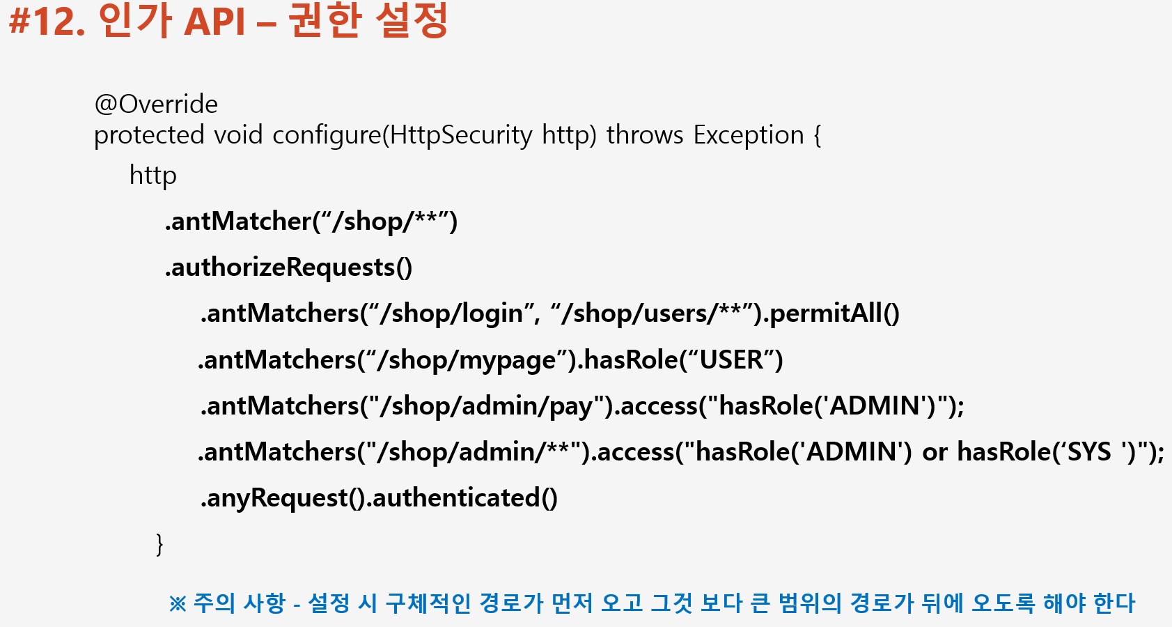 antMatcher(경로) 생략하면 모든경로 권한 확인한다.