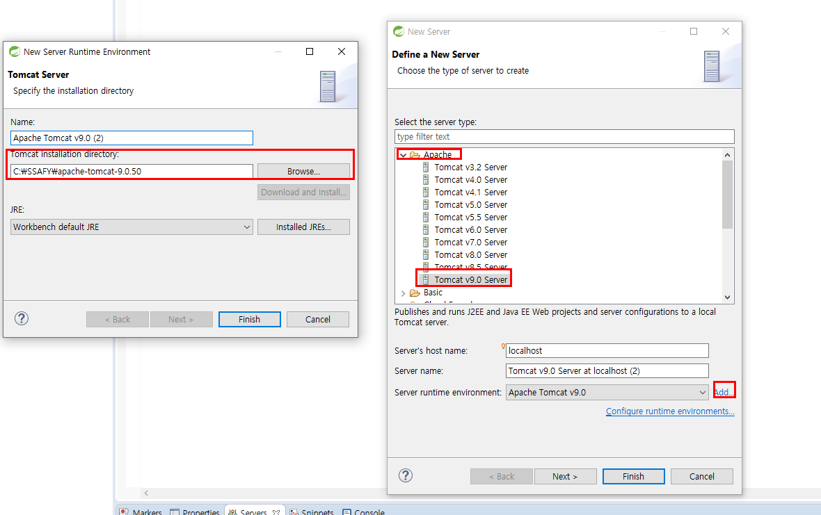 아파치 -> Tomcat 버전 선택 -> Add -> 톰캣 홈페이지에서 다운로드 후 압축 해제 -> Tomcat Iinstallation directory 톰켓 경로 설정 -> Finish -> Finish