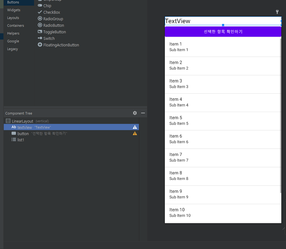구현 방법은 ListView와 동일하며 ListView를 SingleChoice로 설정해준다.