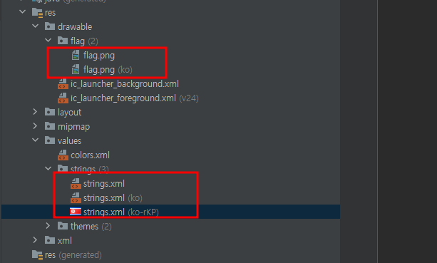 안드로이드는 res 폴더에 있는 리소스 폴더에 국가 코드를 추가하여 지역화를 할 수 있다.