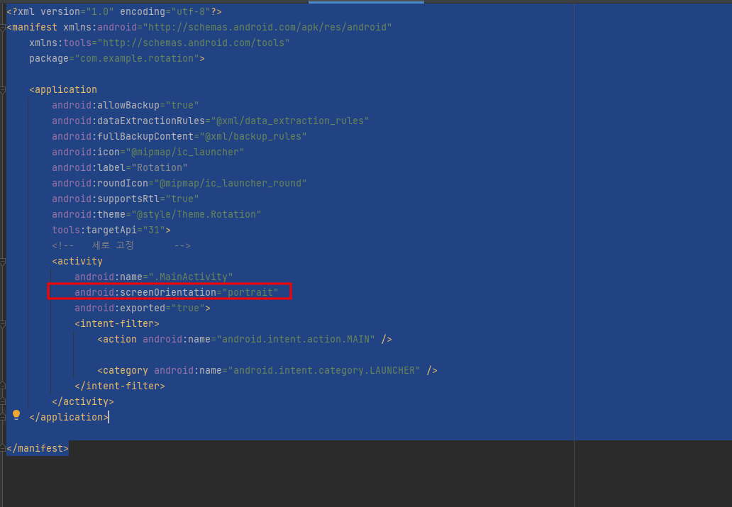 만약 화면이 회전되는 것을 막고 고정시키고자 한다면 AndroidManifest.xml의 Activity 태그에 screenOrientation 속성으로 설정하면 된다.