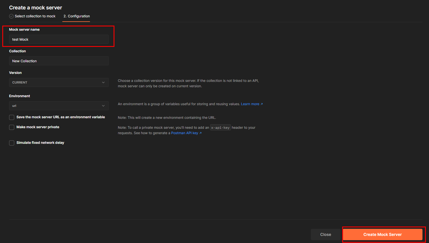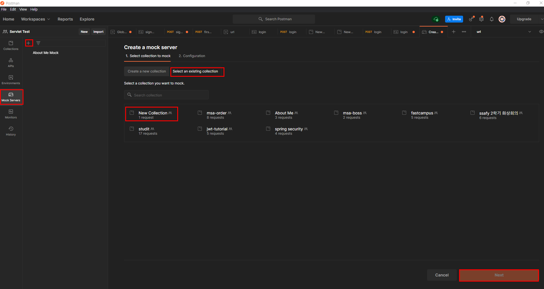 좌측 Mock Servers 클릭 -> + 클릭 -> Select an existing collection -> 클릭 -> 이전에 만든 Collection 클릭