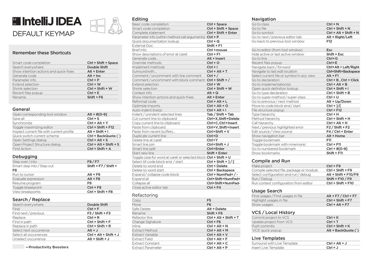 인텔리J(IntelliJ IDEA) 에서는 코드 작성, 편집, 검색, 리팩토링, 디버깅 등 IDE내에서 수행하는 대부분의 작업 명령의 키보드 단축키(ShortCut)을 제공합니다. 자주 사용되는 단축키는 숙지해 두시면 생산성 향상에 큰 도움이 될 수 있습니다.