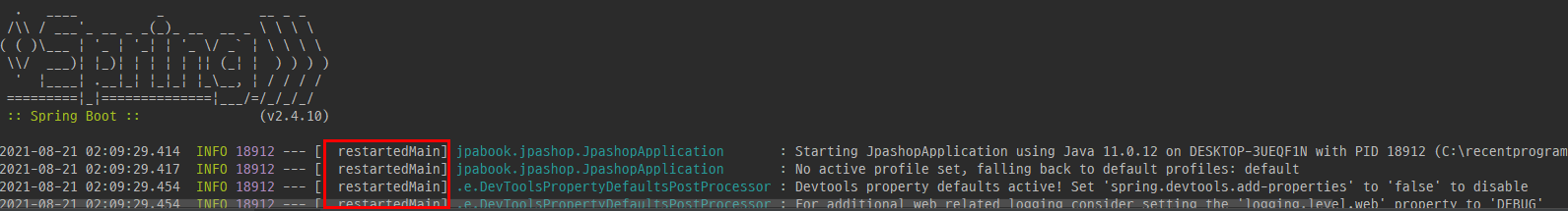 스프링 재시작하면 restartedMain 표시 확인