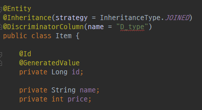 슈퍼타입에 어떤 서브타입을 가지고 있는지 확인하는 컬럼 명 (default="DTYPE")